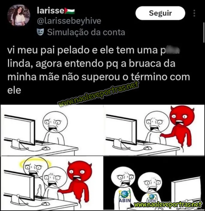 Cuié na net Humor / 05/12/2025 / Deixe um comentário Reza a leda, que o culpado disso são uns zomiii, que não podem ver uma raba diferente. Compartilhar: Facebook WhatsApp Twitter Instagram